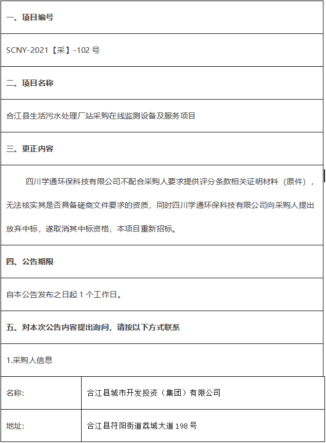 合江縣生活污水處理廠站采購在線監(jiān)測設備及服務項目競爭性磋商結果更正公告