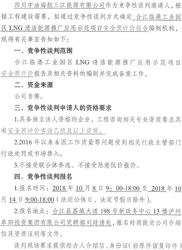 合江臨港工業(yè)園區(qū)LNG清潔能源推廣應(yīng)用示范項目安全預(yù)評價單位競爭性談判公告.docx
