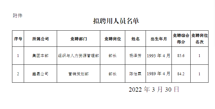 根 據(jù) 《 瀘 州 阜 陽 投 資 集 團 有 限 公 司 關 于 2022 年 部 分 中 層管理崗位內(nèi)部競聘的公告》 的規(guī)定,經(jīng)阜陽集團黨委研究 決定, 擬聘用楊澤芳、 陳怡霖為瀘州阜陽投資集團有限公司 中層管理人員。 現(xiàn)面向社會公示 3 個工作日, 公示時間 2022 年 3 月 30 日至 2022 年 4 月 1 日。 公示期間, 如有問題, 請 及 時 向 瀘 州 阜 陽 投 資 集 團 有 限 公 司 組 織 與 人 力 資 源 管 理 部 反映。 要求舉報者署實名, 實事求是地反映問題, 并提供必 要的調(diào)查線索。
