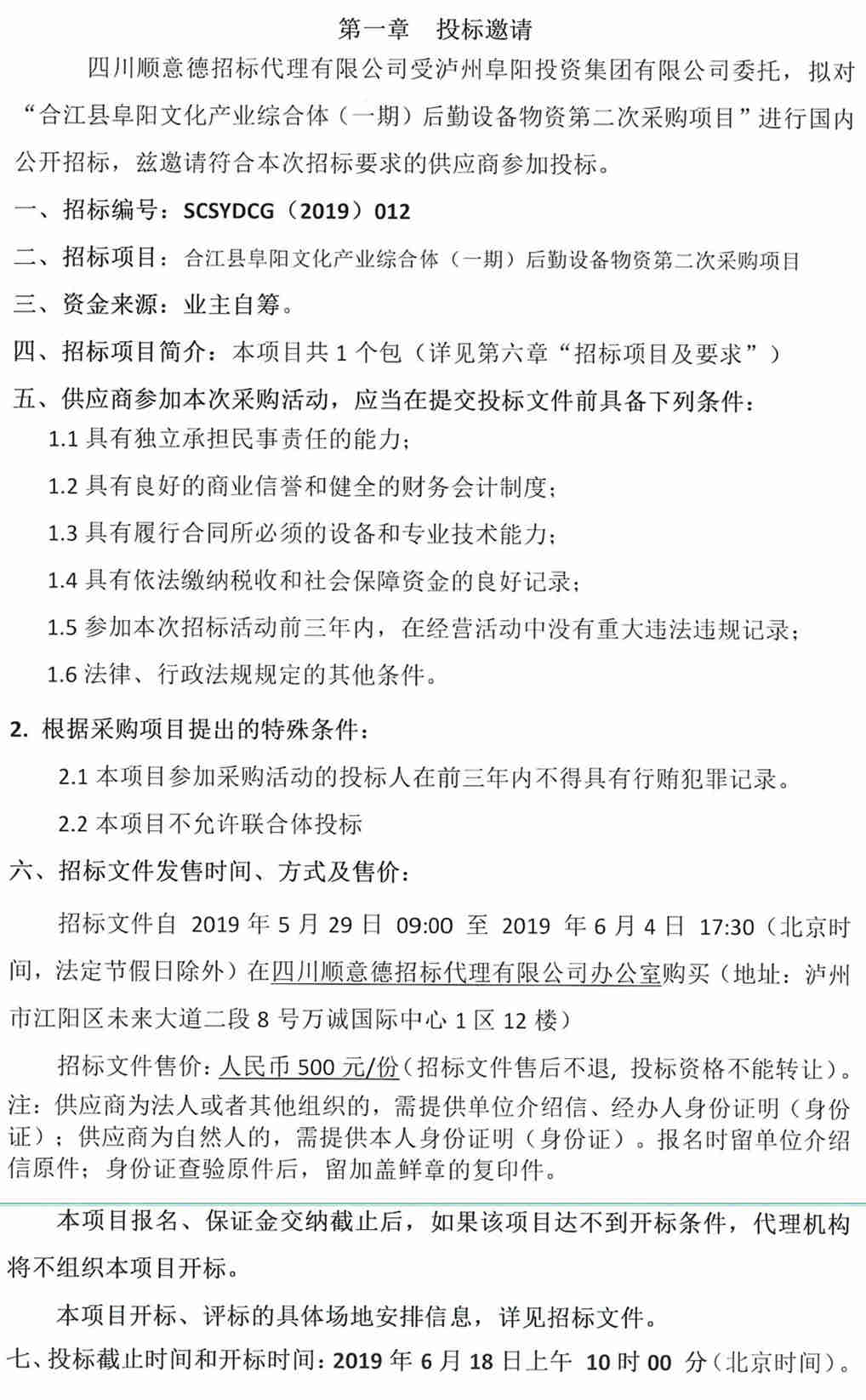 合江縣阜陽文化產(chǎn)業(yè)綜合體(一期)后勤設(shè)備物資第二次采購(gòu)項(xiàng)目