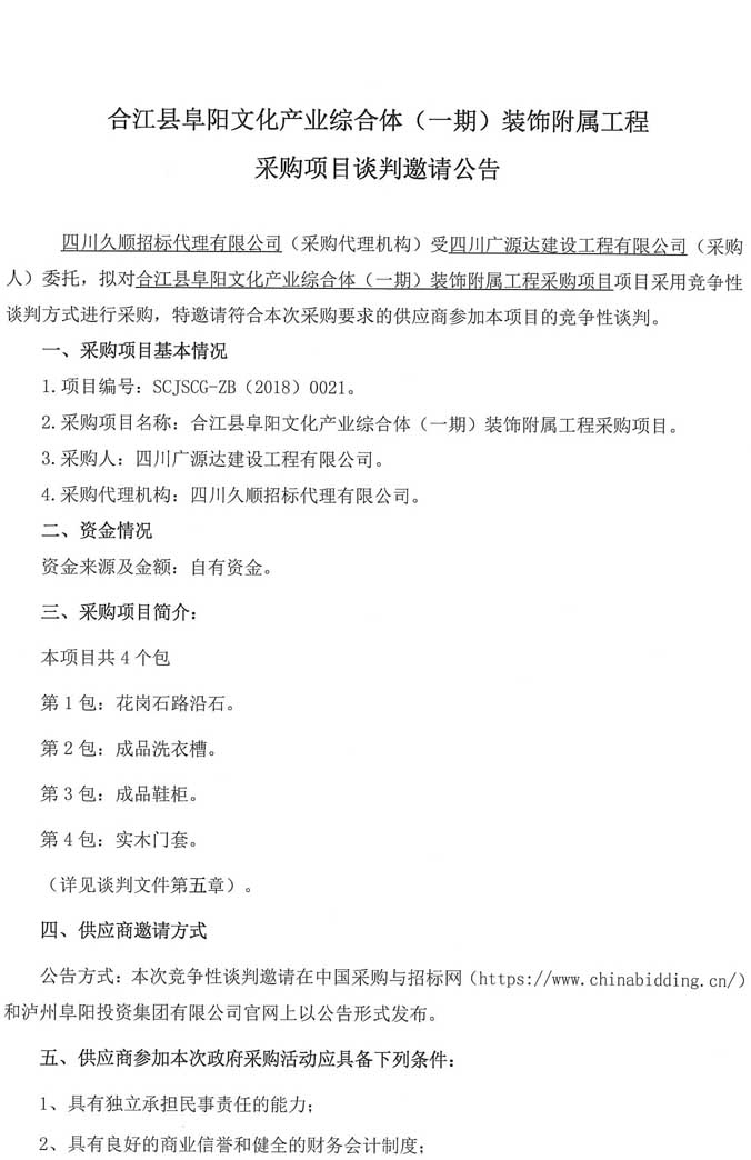 合江縣阜陽文化產(chǎn)業(yè)綜合體(一期)裝飾附屬工程采購項目談判邀請公告.doc