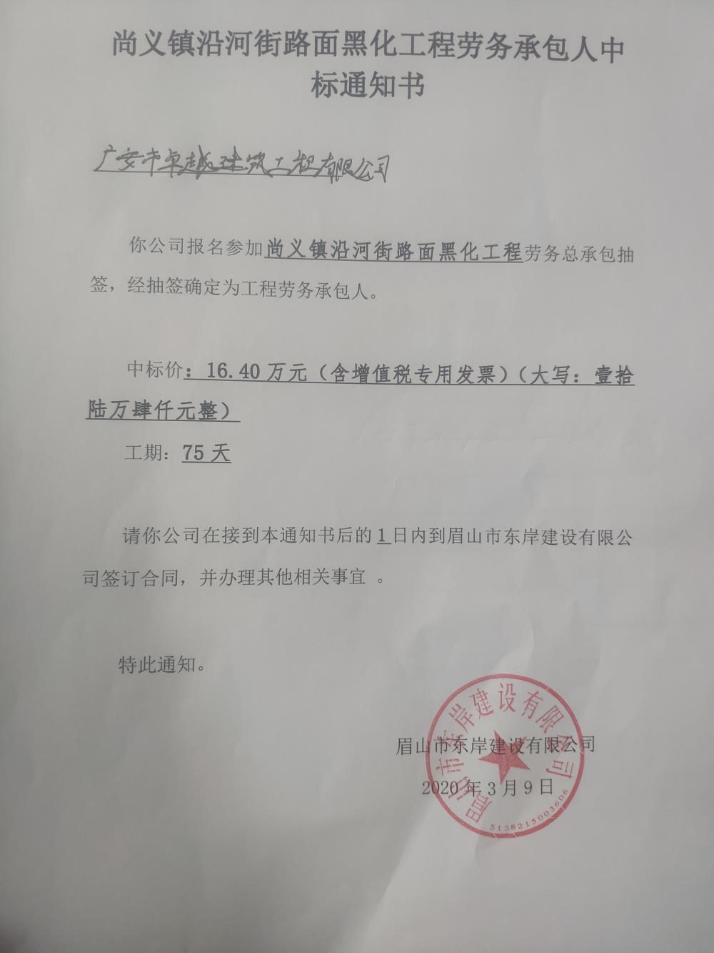 尚義鎮(zhèn)沿河街路面黑化工程中標通知