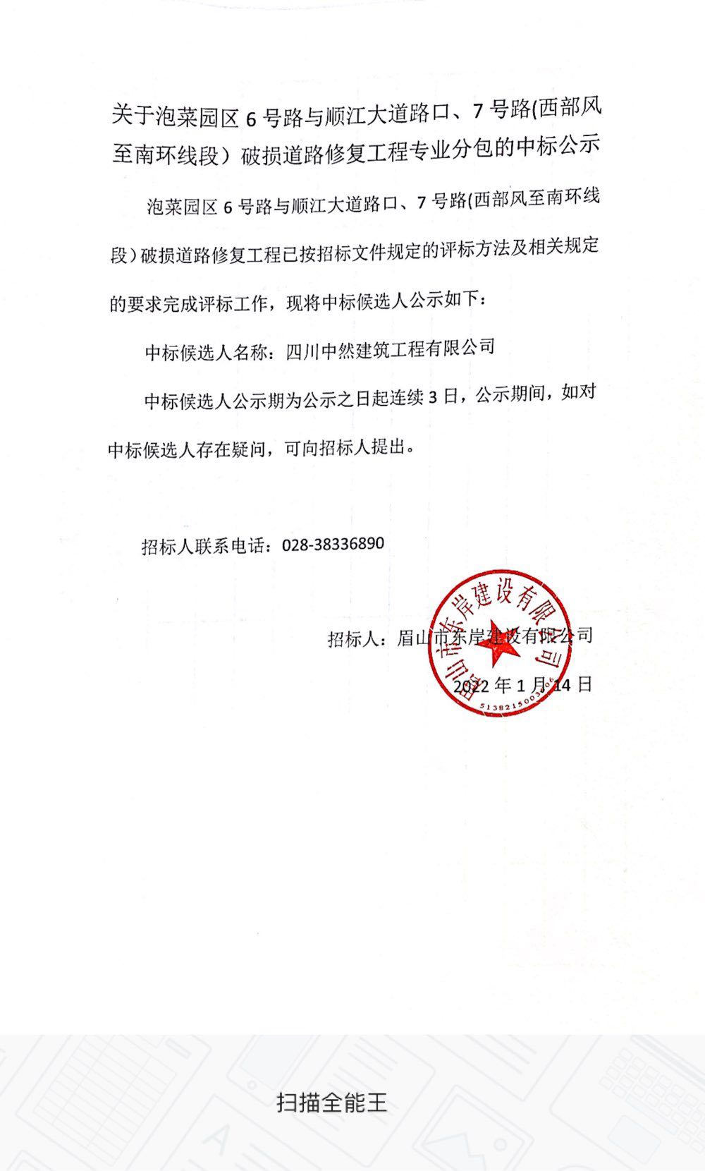 關(guān)于泡菜園區(qū)6號(hào)路與順江大道路口、7號(hào)路(西部風(fēng)至南環(huán)線(xiàn)段)破損道路修復(fù)工程專(zhuān)業(yè)分包的中標(biāo)公示