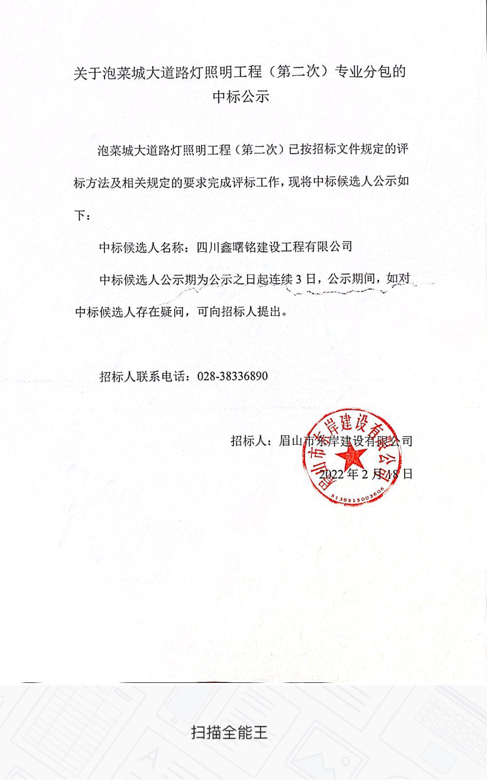 關于泡菜城大道路燈照明工程(第二次)專業(yè)分包的中標公示